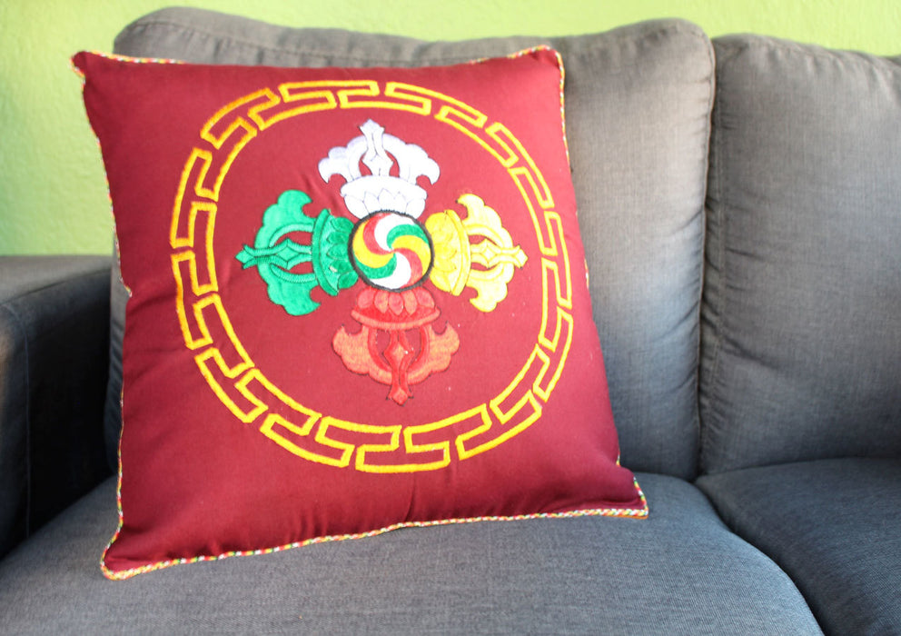 A beautiful hand sewed Hand loom Embroidered Cushion/Pillow Cover made of cotton and looks elegant to brighten your room decor. The embroidery is of the Double Dorje. This design presents a new look and uniqueness to your room decor.