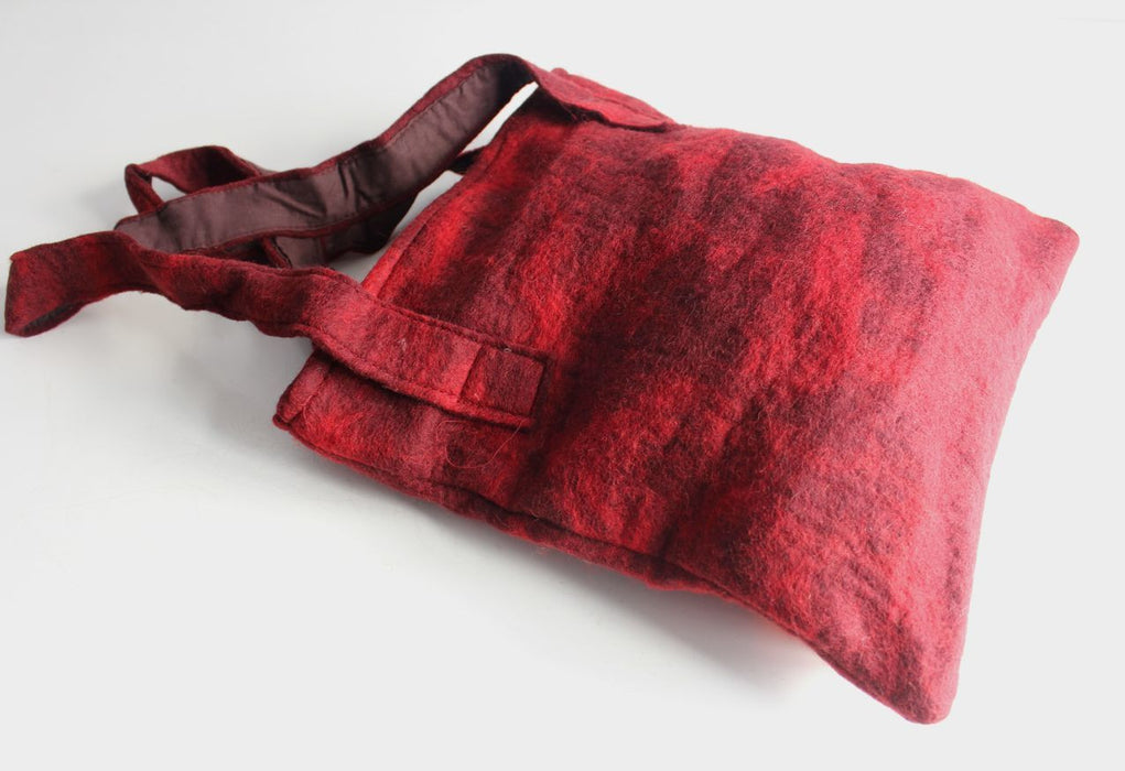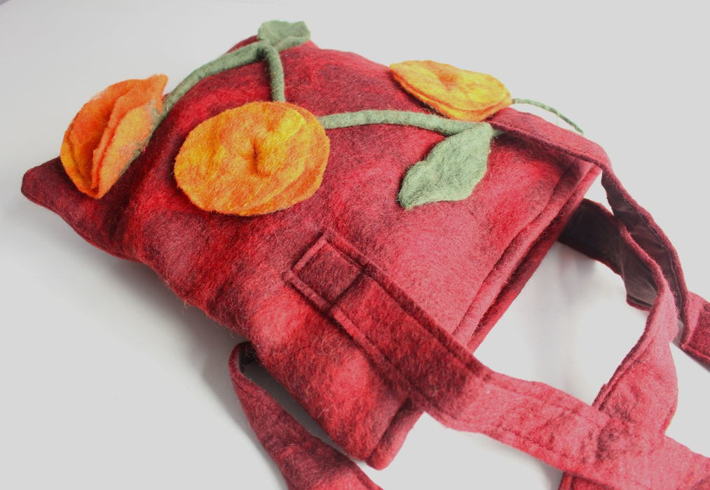 This is a Maroon Felt tote bag with Orange Flowers. This bag is very soft and lightweight. The Bag has a zipper to seal the inside and has broad straps to ease the carrying.