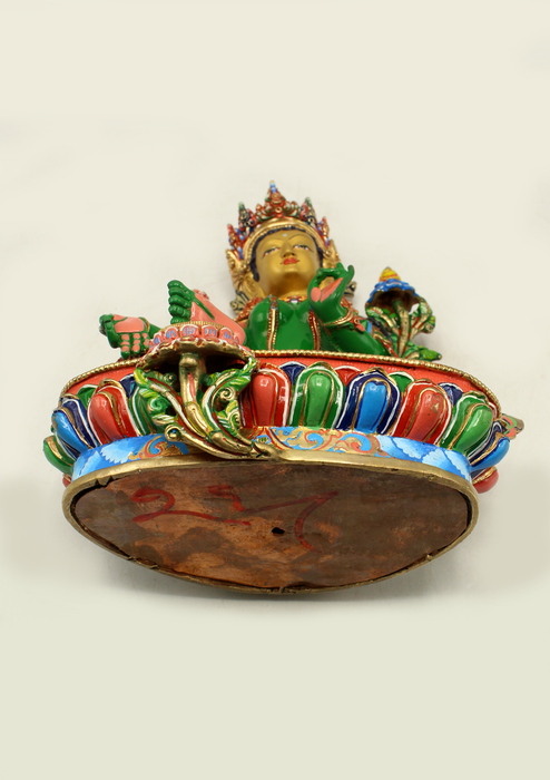 The Hand-Painted Green Tara Statue is a stunning work of art that captures the essence of the beloved female Bodhisattva. Known for her swift compassion and protection, Green Tara is depicted in a graceful seated posture, adorned with intricate details and vibrant colors. Each brushstroke is meticulously applied, bringing to life her serene expression and the delicate floral motifs that symbolize purity and enlightenment. This statue serves as a beautiful reminder of Green Tara's compassionate presence and her role as a protector and guide for those who seek her blessings.