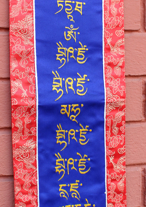 This is a beautiful Polyester Brocade Wall Hanging Banner. The medicine Buddha's mantras are beautifully embroidered on a Dark Blue polyester fabric and is framed by a beautiful Red Gold Polyester Brocade. This banner is idle to be hung around the altar room, living room, study room.