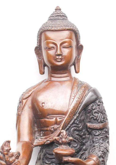 This is a 8.2 inch high Copper Statue of Healing Buddha. The robe of Buddha is extensive carved along the edges with motifs.