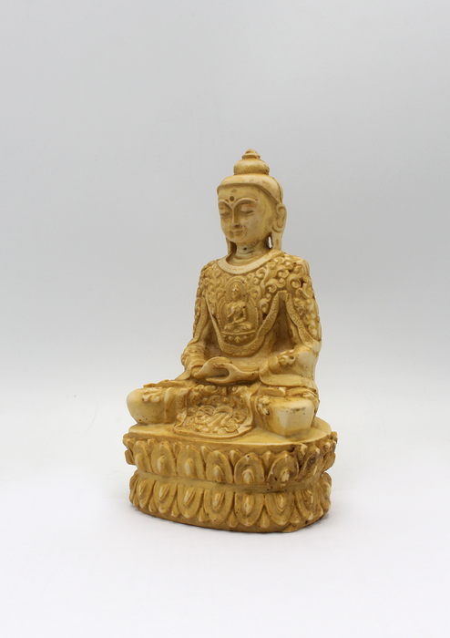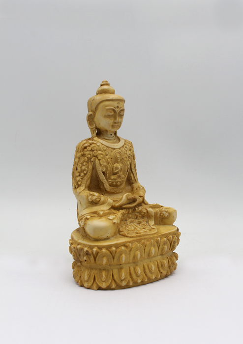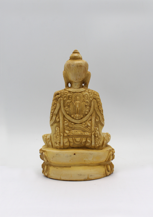 This is a Resin statue of Meditating Buddha in a meditative posture without the vase in the hands. In this resin statue, Meditating Buddha is seated in Dhyana Asana or Meditative Pose, also called Padmasana. In this position, the legs are crossed, closely locked with the soles of both feet visible. Lord Buddha is wearing a detailed carved monastic robe incised with floral motifs. He is seated on a double lotus base also known as Padmasana. The monastic robe also has intricate carvings of three Buddhas: Blessing buddha around the chest, standing Buddha at the upper back and reclining Buddha at the lower back.