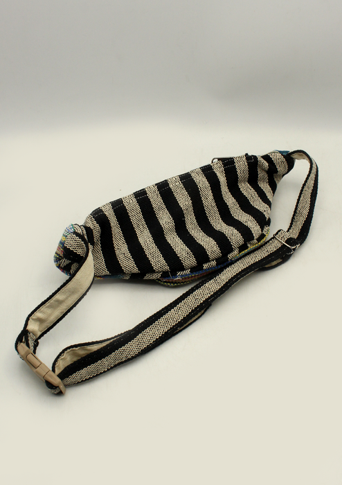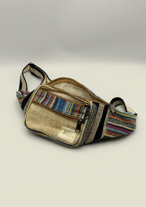The hemp fanny pack is made in Nepal with pure hemp fiber. This fanny pack has four various sized pouches all with zipper. The waist strap is 44 inches in total and adjustable.
