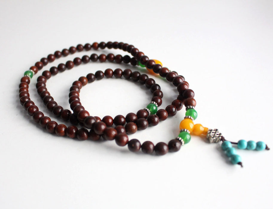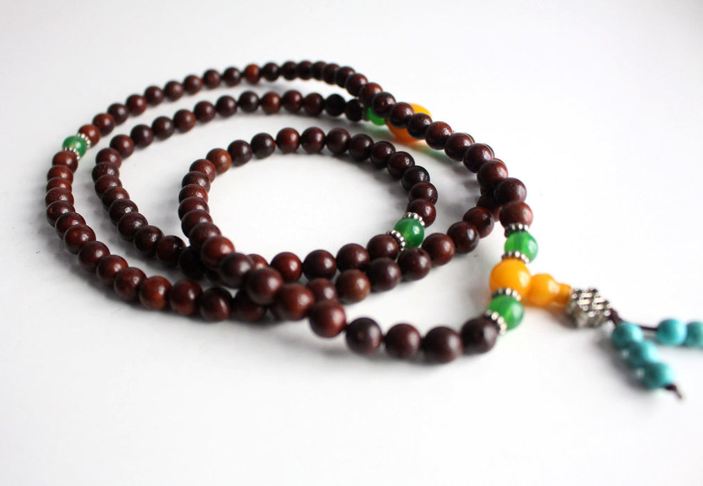 This is a beautiful Rose Wood 108 Prayer beads strung together in an elastic band with Charm and Amber Malachite spacers.