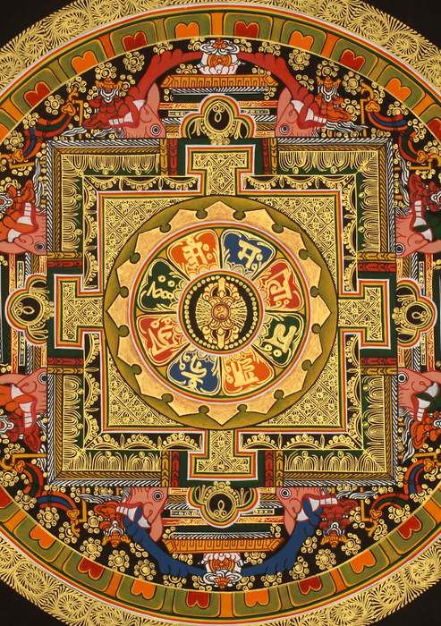 This is a beautifully hand painted mandala thangka painting from Nepal. This mandala thangka is a beautiful representation of Buddhist cosmology and spirituality, intended to aid in meditation and convey profound teachings through its intricate design and symbolism.