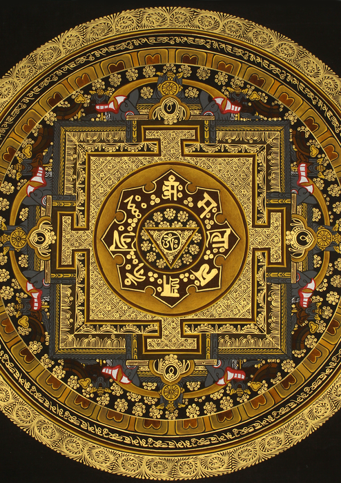 This is a beautifully hand painted mandala thangka painting from Nepal. This mandala thangka is a beautiful representation of Buddhist cosmology and spirituality, intended to aid in meditation and convey profound teachings through its intricate design and symbolism.