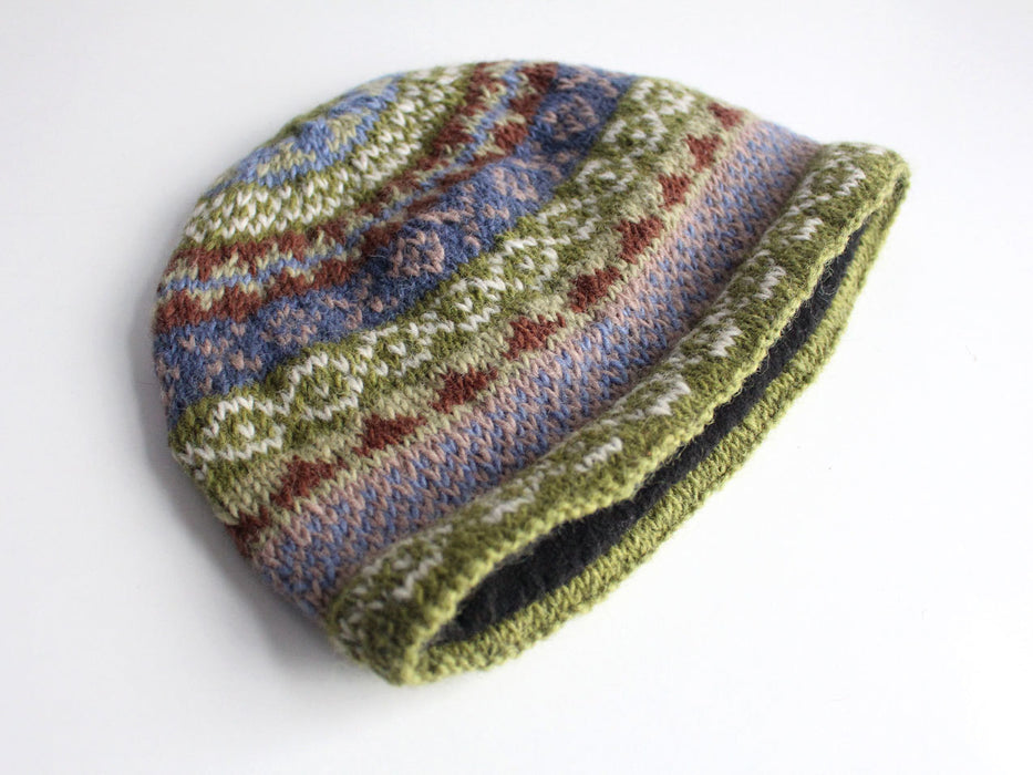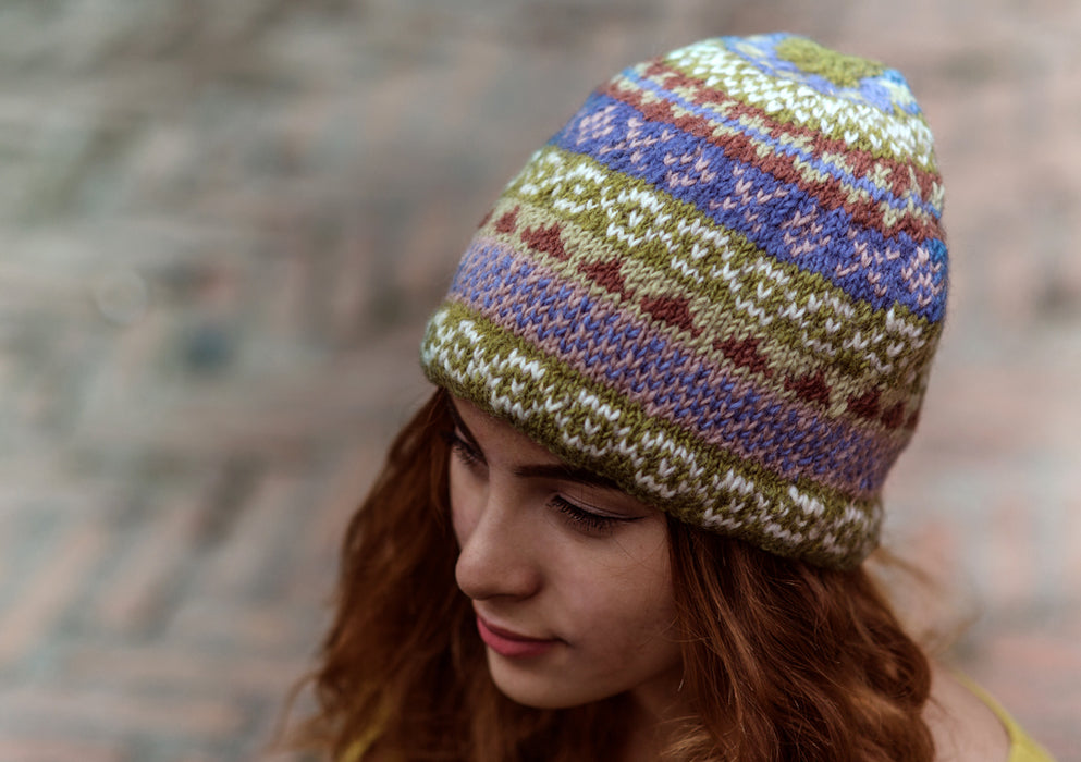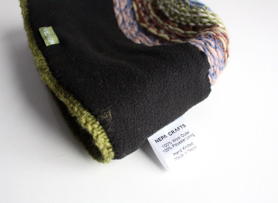 This is a beautiful Hand Knitted geometric patterned pure woolen Sherpa beanie. Hand knit in Nepal from the finest New Zealand Sheep wool, these woolen yarns are naturally dyed using Swiss Clariant Process. Hence, the bright colors give the cap a great look. The cap is equipped with inner lining of fleece for extra warmth and smoothness.