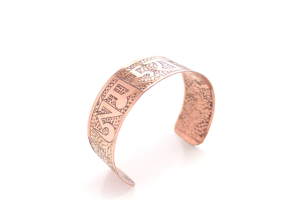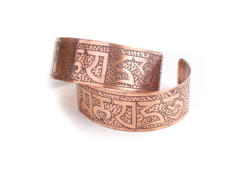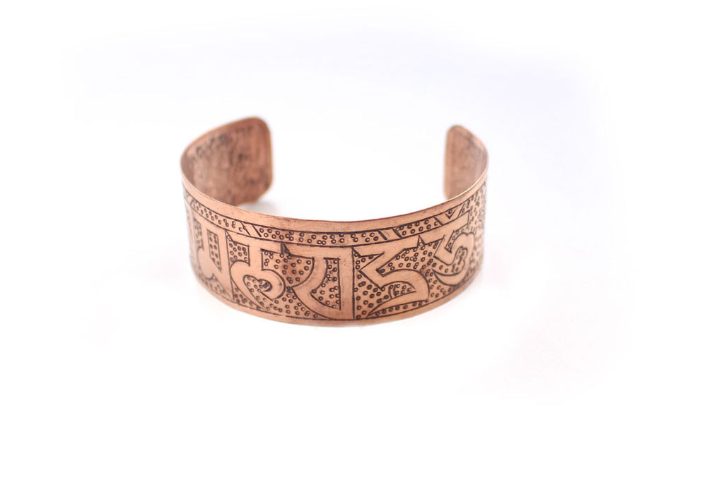 This is a copper unisex bracelet. Om Mani mantra and flowers are carved around the bracelet. Also believed to maintain and balance bodily vibes, these bracelets have been extensively used from many generations in Tibet, Nepal and India.