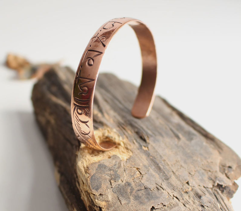 This is a copper unisex bracelet. Om Mani mantra are carved around the bracelet. Also believed to maintain and balance bodily vibes, these bracelets have been extensively used from many generations in Tibet, Nepal and India.
