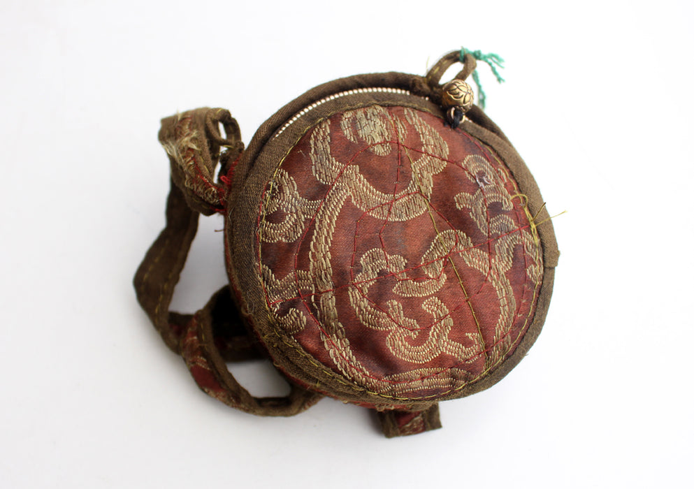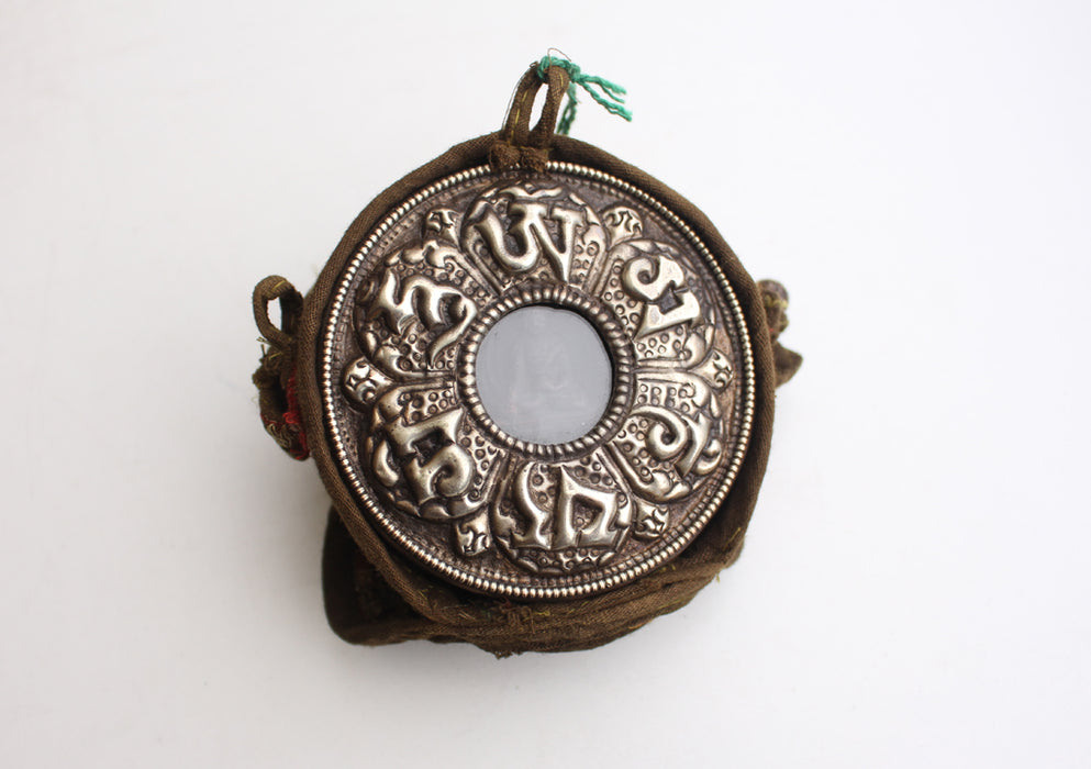 Om Mani Carved White Metal Shakyamuni Buddha Ghau Pendant in a Cotton Bag