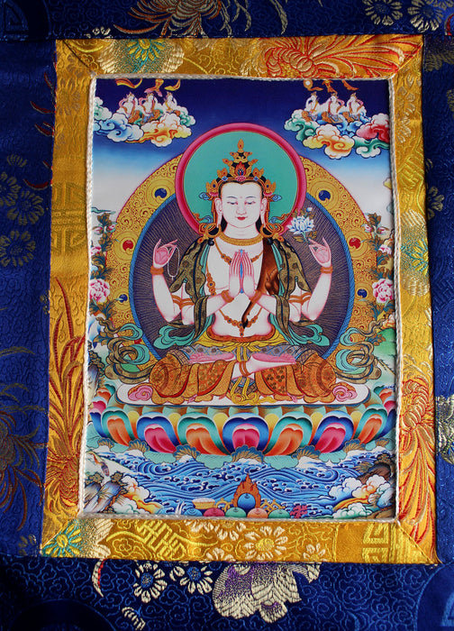 This is an affordable alternative chenrezig photo thangka to expensive hand drawn thangka painting. The screen printed photo of Four Armed Chenrezig is framed by a beautiful Silk Brocade with long fringes.