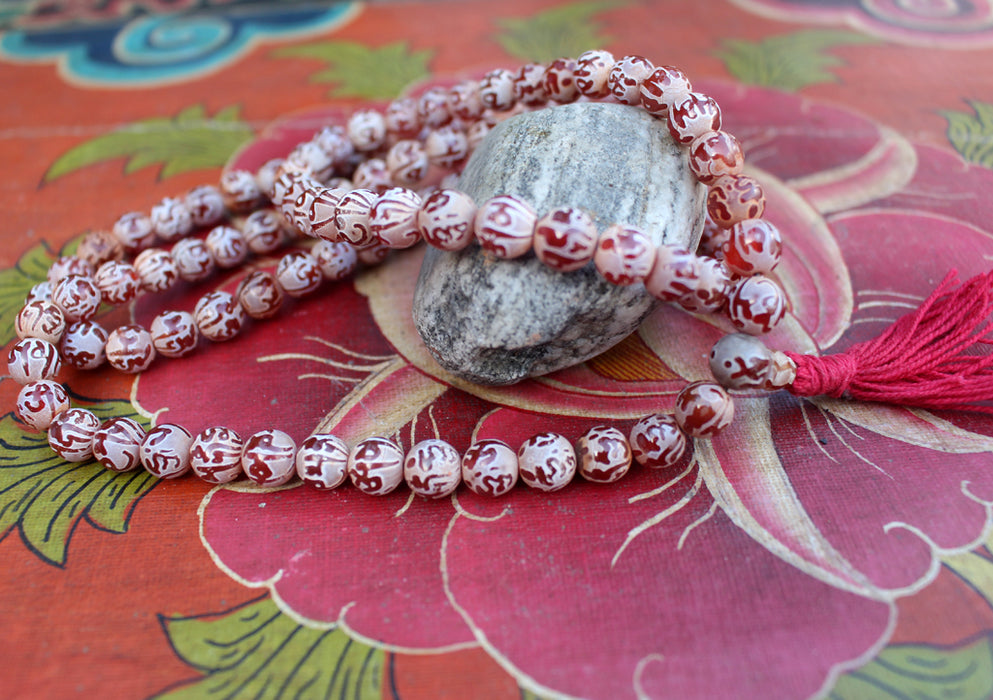 Om Mani Etched Carnelian Prayer Beads Mala, Yoga and Meditation Mala
