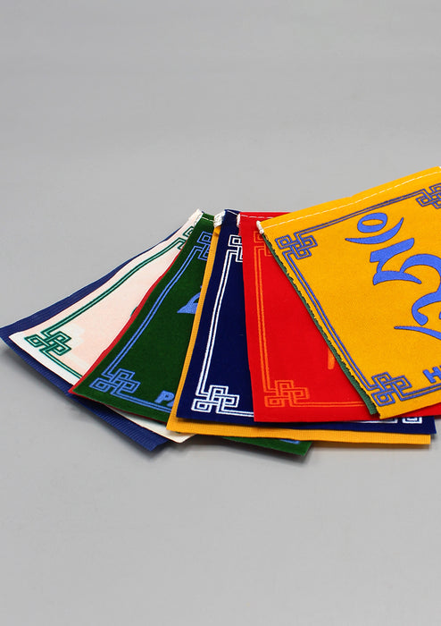 These Tibetan Prayer Flags are made of Velvet and are printed with Om Mani Padme Hum Mantra. These Prayer Flags are the largest in the variation and are best suited for small altars or indoors. It can be hanged in the frames of deities or you can find other uses and placements for it.