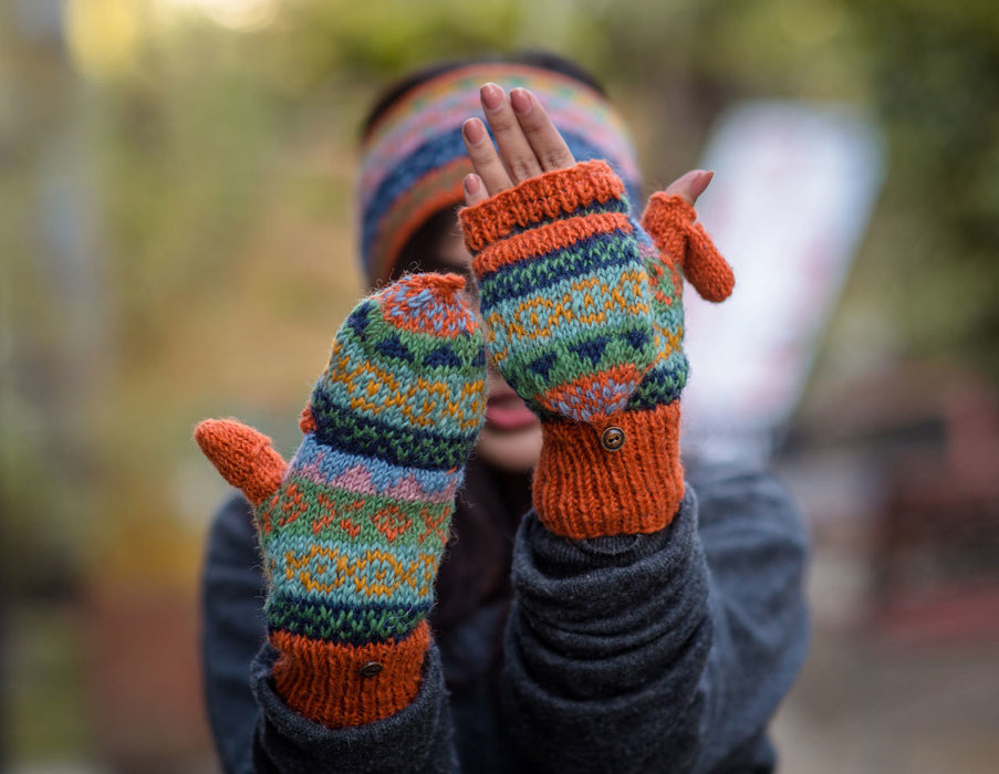 These are Orange Pure and Soft Woolen Mittens which are convertible to Full length Mittens covering the full hand and also as half fingered texting gloves. The upper covers of the mittens can be folded back and buttoned to keep it as half finger gloves. The mittens are equipped with fleece lining for extra warmth and to avoid scratchiness.