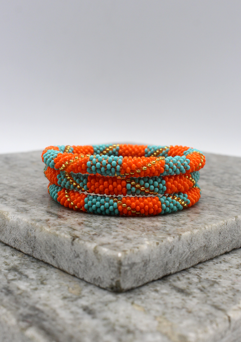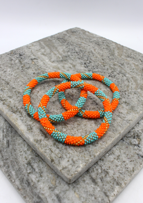 Orange Blue Nepalese Roll On Bracelet has been meticulously crocheted by our women artists. Our women artists have carefully hand-strung this fairly traded Roll On bracelet.