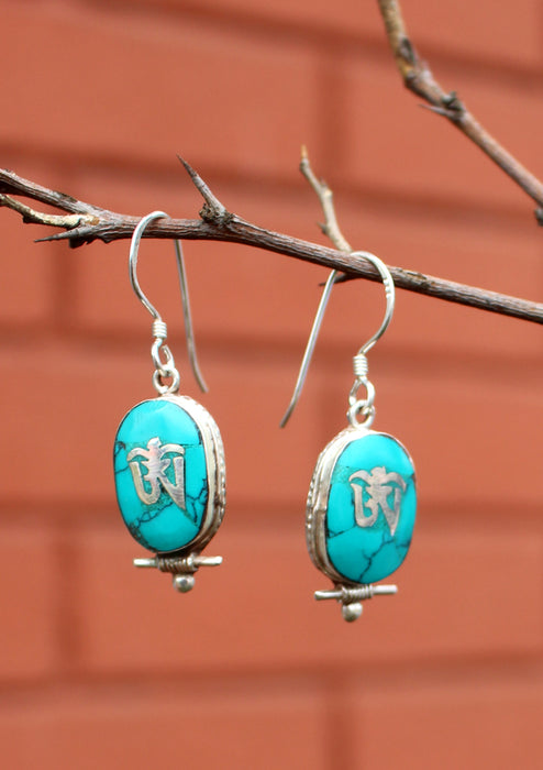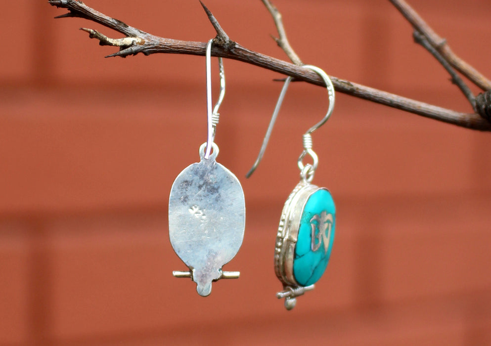 Oval Turquoise Inlaid Tibetan Om Silver Earrings