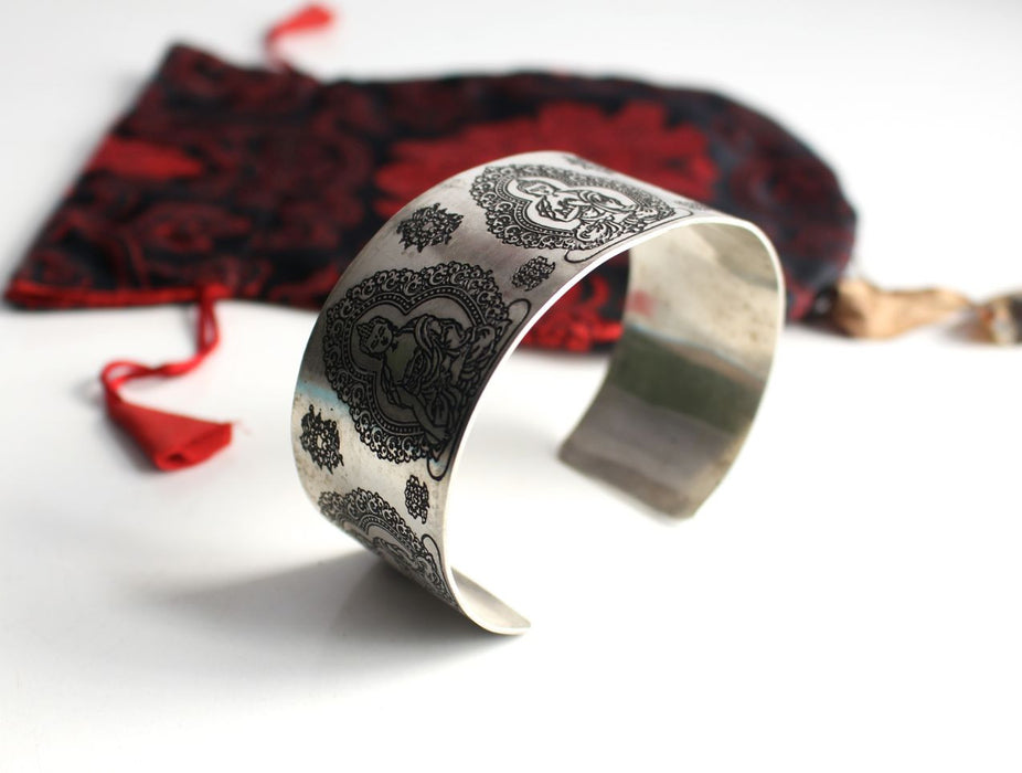 A meticulously carved broad cuff Tibetan Bangle made of white metal. The images of Pancha Buddha are carved side by side throughout the bangle. A great piece of Tibetan arts and crafts and a must have accessory for people performing yogas, meditation, spiritual journeys and healing.