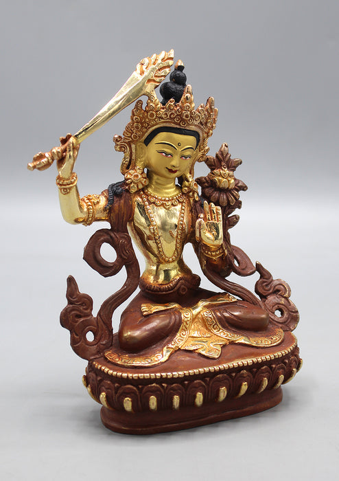 This is a partly gold plated Copper Statue of Manjushree. The face of the Manjushree is gold painted.