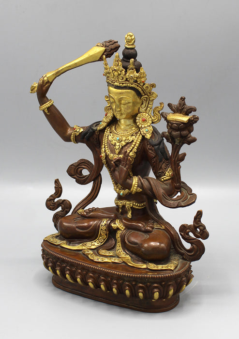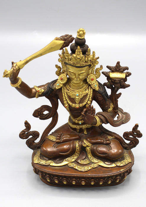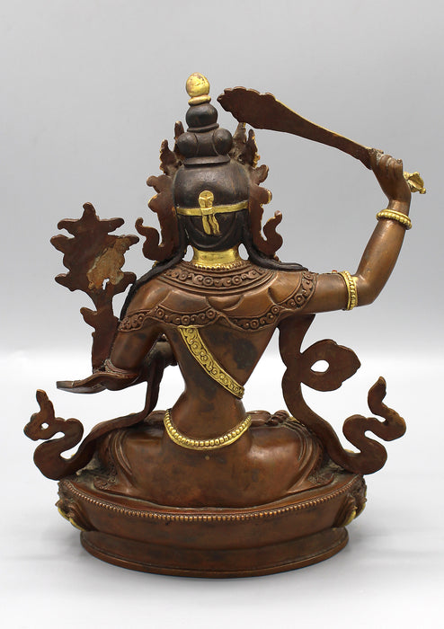 This is a partly gold plated Copper Statue of Manjushree. The face of the Manjushree is gold painted.