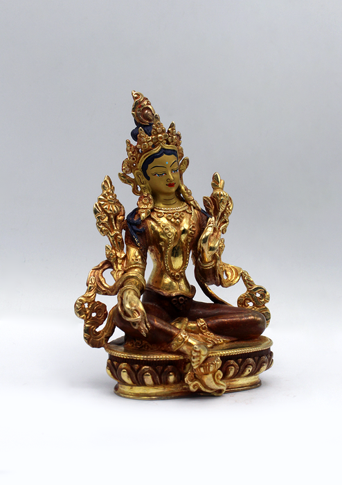 This partly gold-plated Green Tara Statue exudes grace and divine compassion.