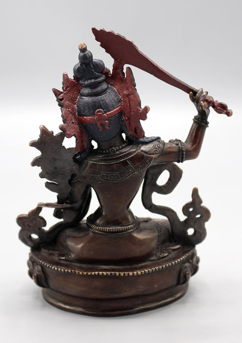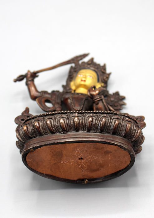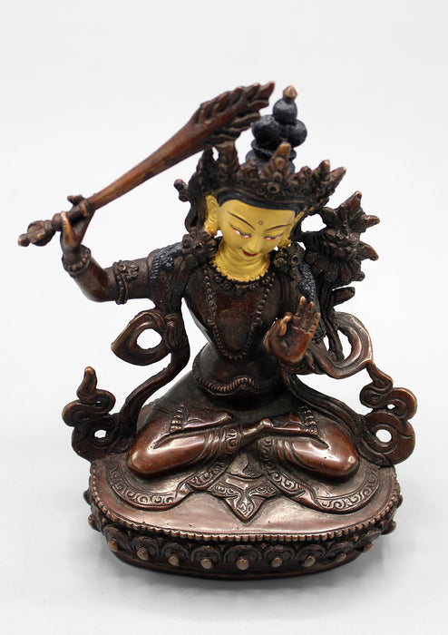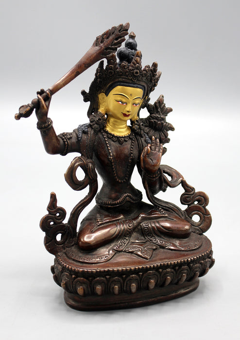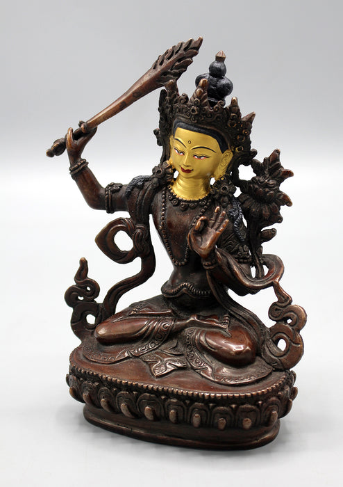 Made by a third generation sculptor, this is a beautifully sized and detailed partly gold plated Manjushri statue. Made of copper about 10 years ago, this statue had been sitting in the collection of an artist whom we recently met in June 2017. It has been NepaCrafts mission to help and support artists from different walks of life. In this journey, we found this beautiful Manjushri statue. With diminishing demands for statues, lowered prices for works of arts due to high competition with machine made statues, the artist was not able to sell his statues on a timely basis and had collections of over 50 statues. And on our mission to uplift the lives of artisans and to help them with sustainable income, we purchase the statue and are bring them to you.