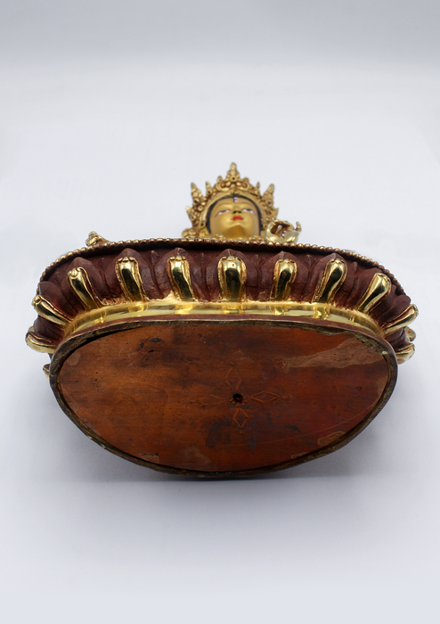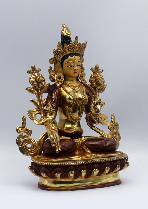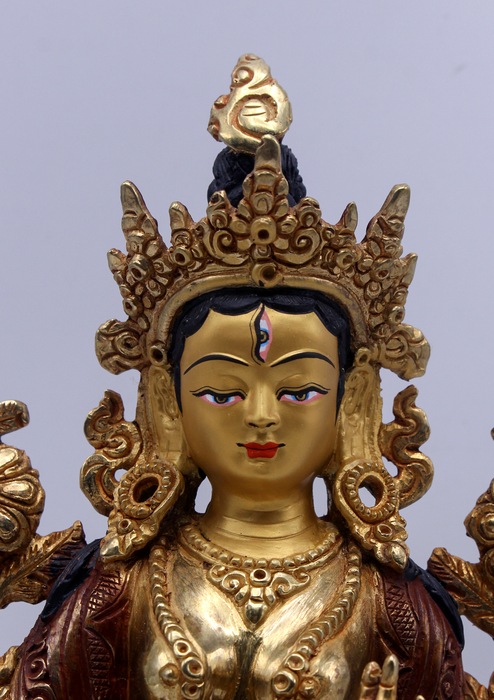 Depicted in a serene and graceful posture, often seated in meditation with a lotus flower, White Tara is adorned with seven eyes symbolizing her watchfulness and omnipresent compassion. Her gentle expression radiates peace and purity, offering blessings of protection, health, and long life. The intricate details in the statue, from her calm gaze to the flowing robes, capture her divine qualities, making it a beautiful reminder of nurturing energy and the healing power of compassion.