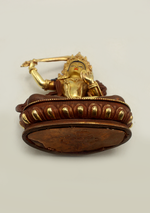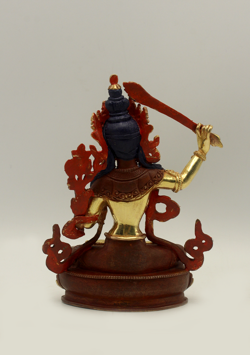 A Manjushri statue represents the Bodhisattva of Wisdom, depicted holding a flaming sword in his right hand to cut through ignorance and a lotus flower in his left hand that supports the Prajnaparamita sutra. Seated in a calm and contemplative posture, Manjushri embodies clarity of mind and intellectual understanding, helping devotees gain insight and enlightenment.