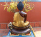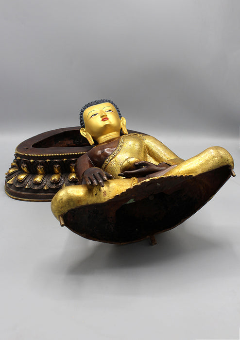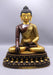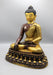 This is a Copper Shakyamuni Buddha Statue which is partly gold plated around the face and the monastic robe along with some petals in the double lotus asana. The carvings of various floral motifs in the robe of the Buddha is very finely detailed and carved out in the most intricate fashion. The gold plated face and the carving in the robe are the main highlights of this statue.