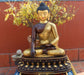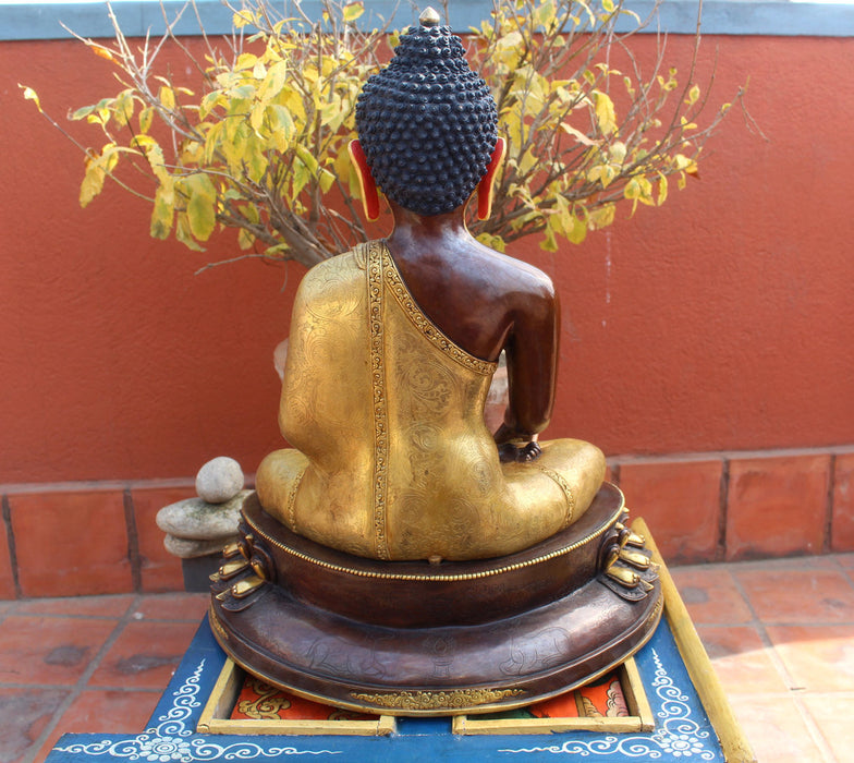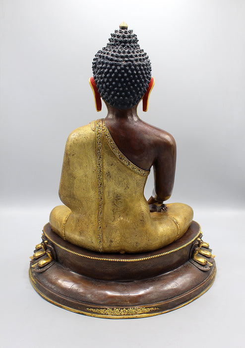 Shakyamuni Buddha Statue is seated in Dhyana Asana or Meditative Pose, also called Padmasana. In this position, the legs are crossed, closely locked with the soles of both feet visible. Lord Buddha is wearing a detailed carved monastic robe incised with floral motifs. He is seated on a single lotus base also known as Padmasana. His left hand is in the earth touching gesture or bhumisparsha mudra, while his right hand holds a medicine bowl.