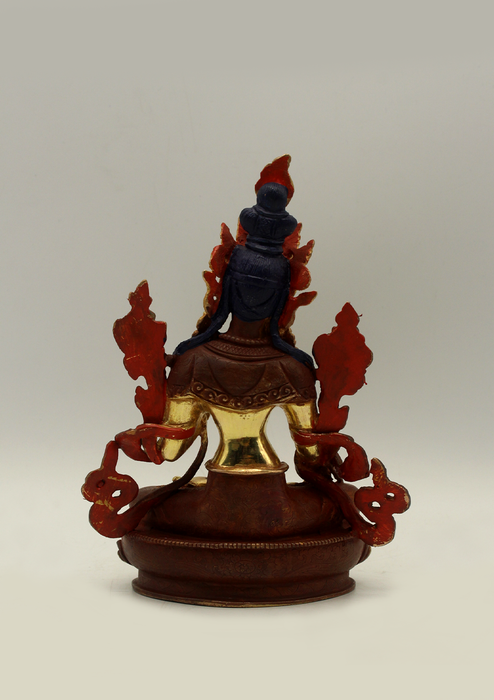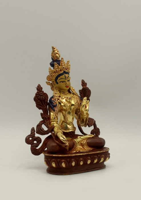 A White Tara statue portrays the goddess of compassion, healing, and longevity. She is depicted with seven eyes (one on her forehead, two on her palms, two on her soles, and two in her usual place) symbolizing her watchfulness and awareness. White Tara is often shown seated in a meditative posture, holding a lotus flower. She embodies serenity and grants blessings for long life and health.