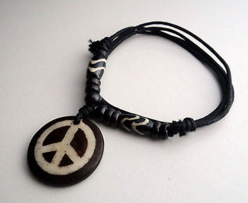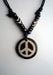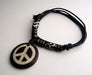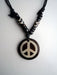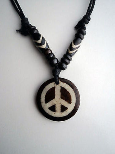 A beautiful bone necklace with a peace pendant which has been corded to a black thread with barrel beads. The bones are collected only after the animal has been consumed for meat. No Commercial slaughtering is done for the purpose of making bone products.