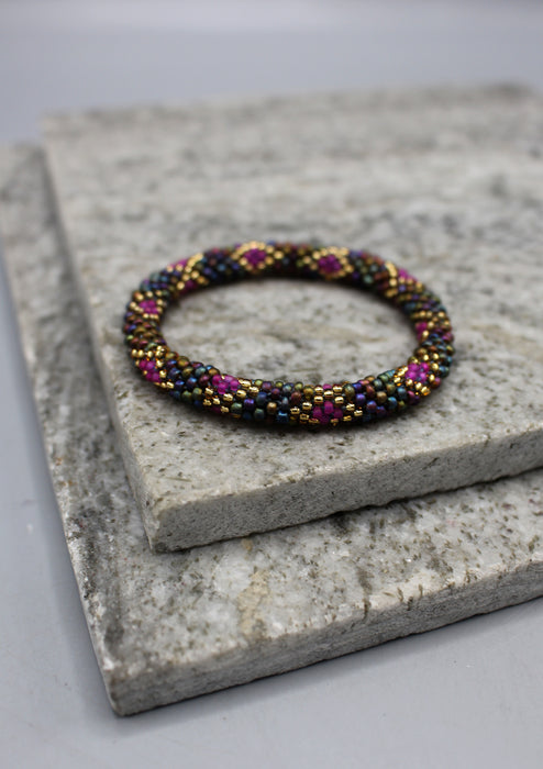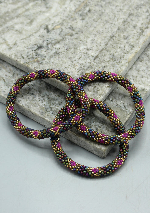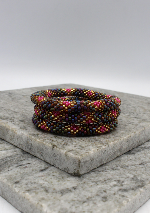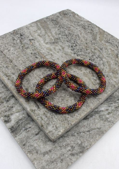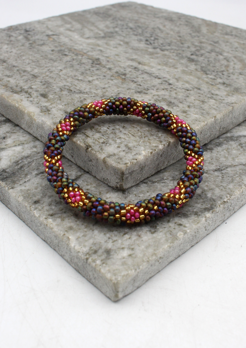 This is a very beautiful and stylish roll on glass beads bracelet handmade in Nepal. Made with the finest quality Czech and Japanese beads, the bracelet stretches as you roll it over your wrist. It fits most wrists as it is adjustable and will roll over around your wrist.
