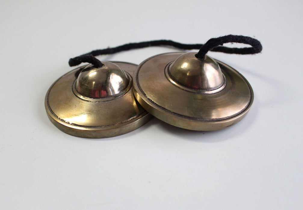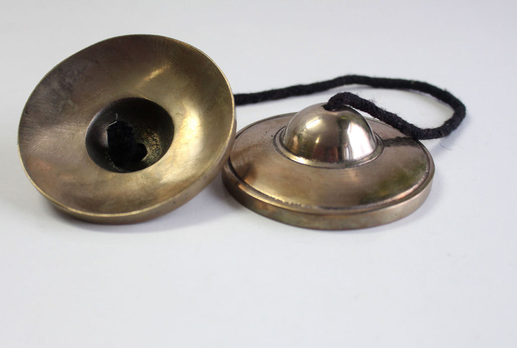 Tingshas are two metal small cymbals joined by thread or leather strap. It is commonly used by Tibetan practitioners during prayers and ritual ceremony. These two metal cymbals are struck together to produce a high pitched clear tone. Thingsha cymbals are quite thick which helps in producing long ringing sounds of a bell.