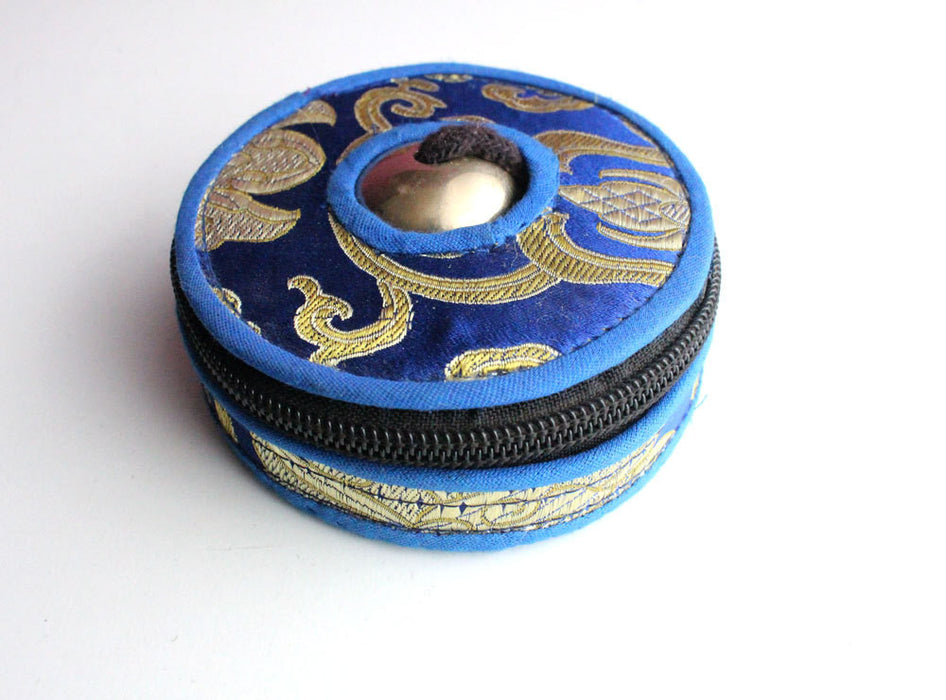 These beautiful sounding plain tingshas or metal cymbals come with the silk brocade red, green and blue gift pack cover you can choose from.