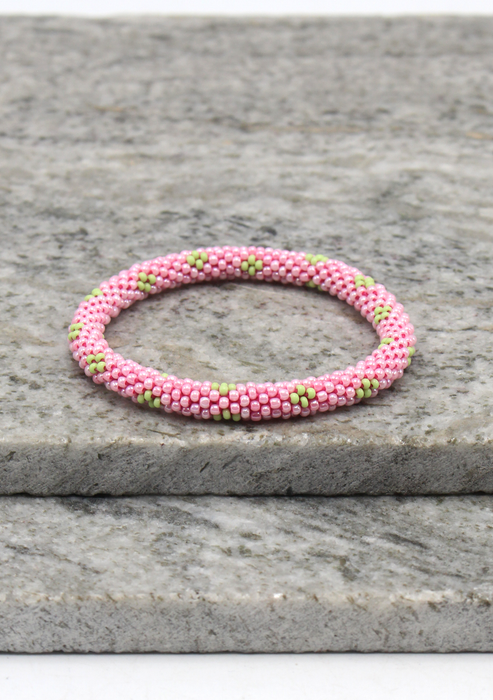 Pretty Pink Nepalese Roll On Bracelet has been meticulously crocheted by our women artists. Our women artists have carefully hand-strung this fairly traded Roll On bracelet.