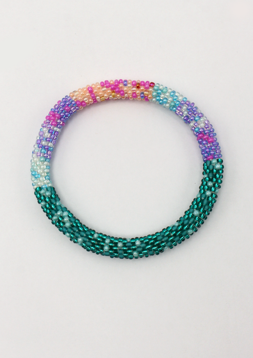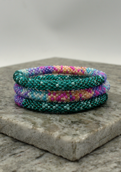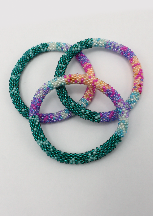 These fairly traded glass beads bracelet are meticulously crocheted by our women artists. Our woman artist carefully hand-strung these Roll On bracelet to give them the best shape and design.