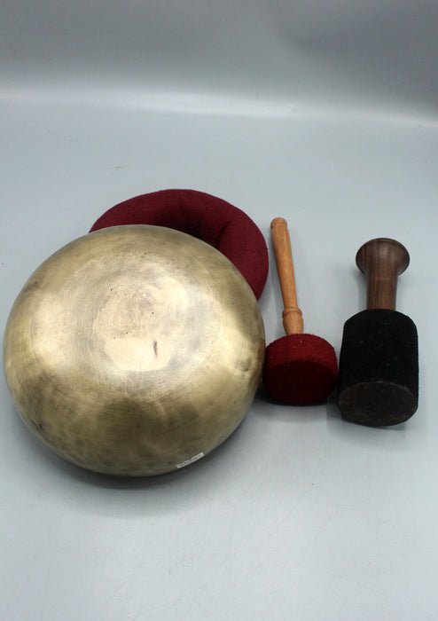 This is a Nepalese Healing Old Singing Bowl with Maroon Ring Cushions, Felt Drum stick and a Mallet.