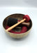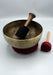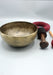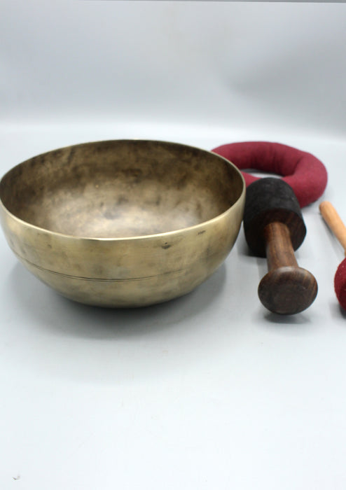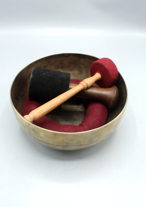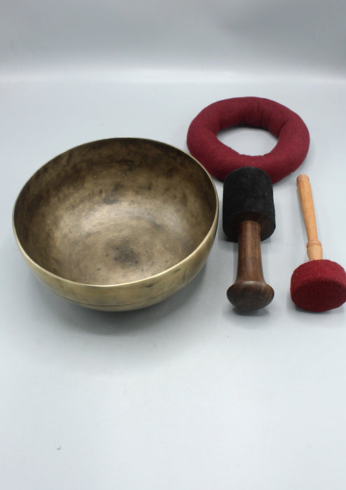 This is a OLD Tibetan Healing Singing Bowl with Maroon Ring Cushions, Felt Drum stick and a Mallet.