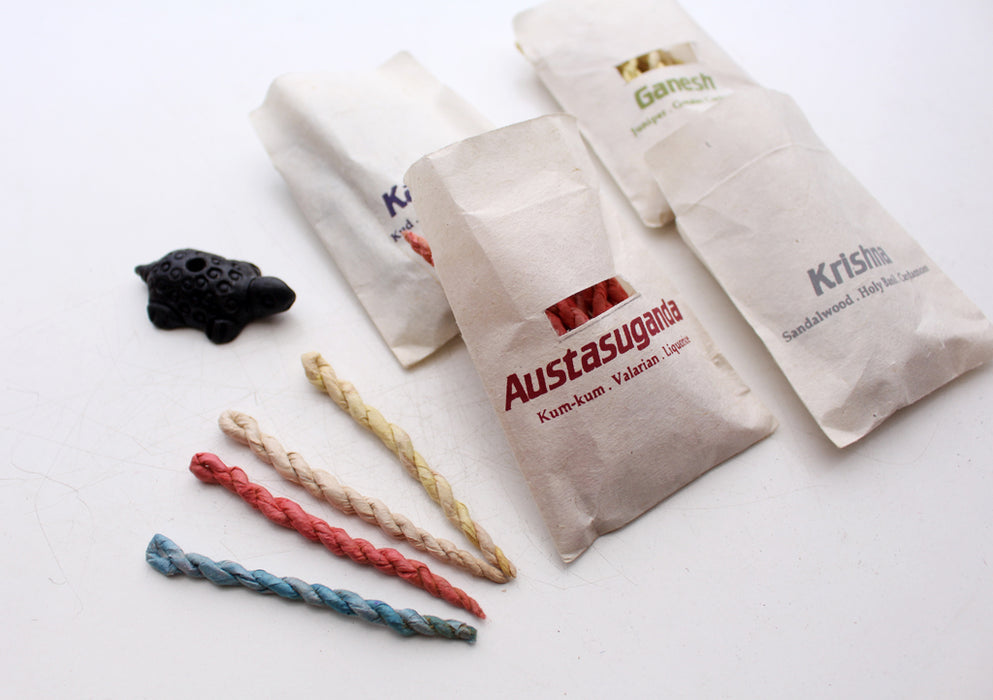 The incenses are wrapped in a Nepalese lokta paper box in a separate lokta paper pouch. The individually wrapped incenses are as follows: