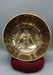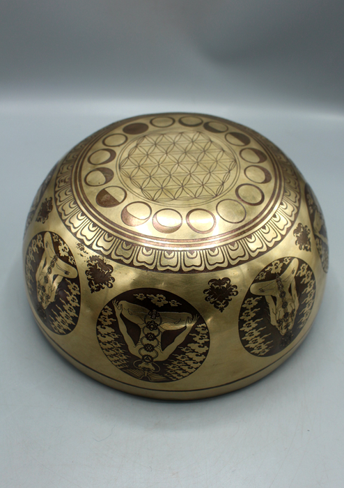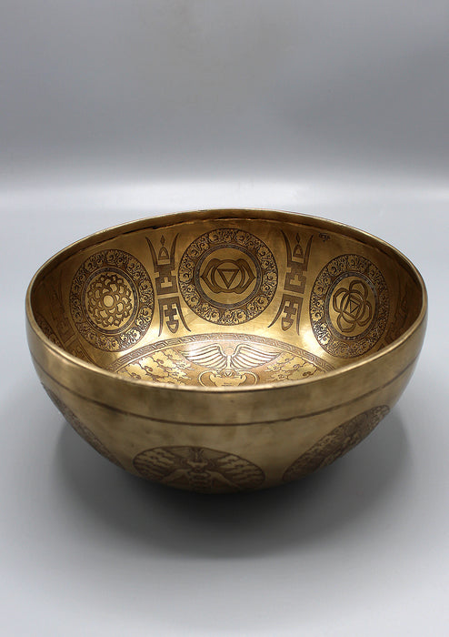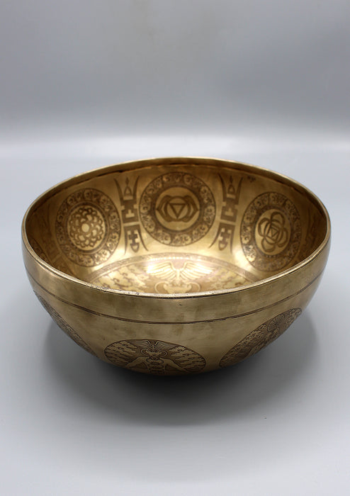 This is a brass singing bowl hand carved in Nepal. The singing bowl is beautifully carved with seven chakra symbol of human body in a meditative posture. The edges of singing bowl is finely carved with symbol of chakras.