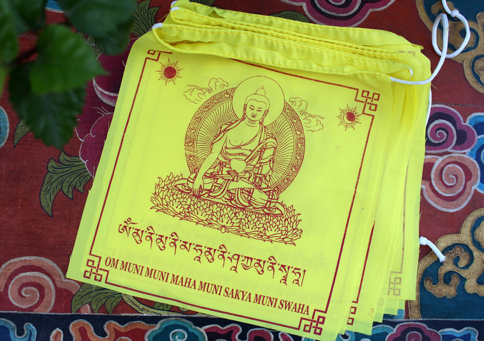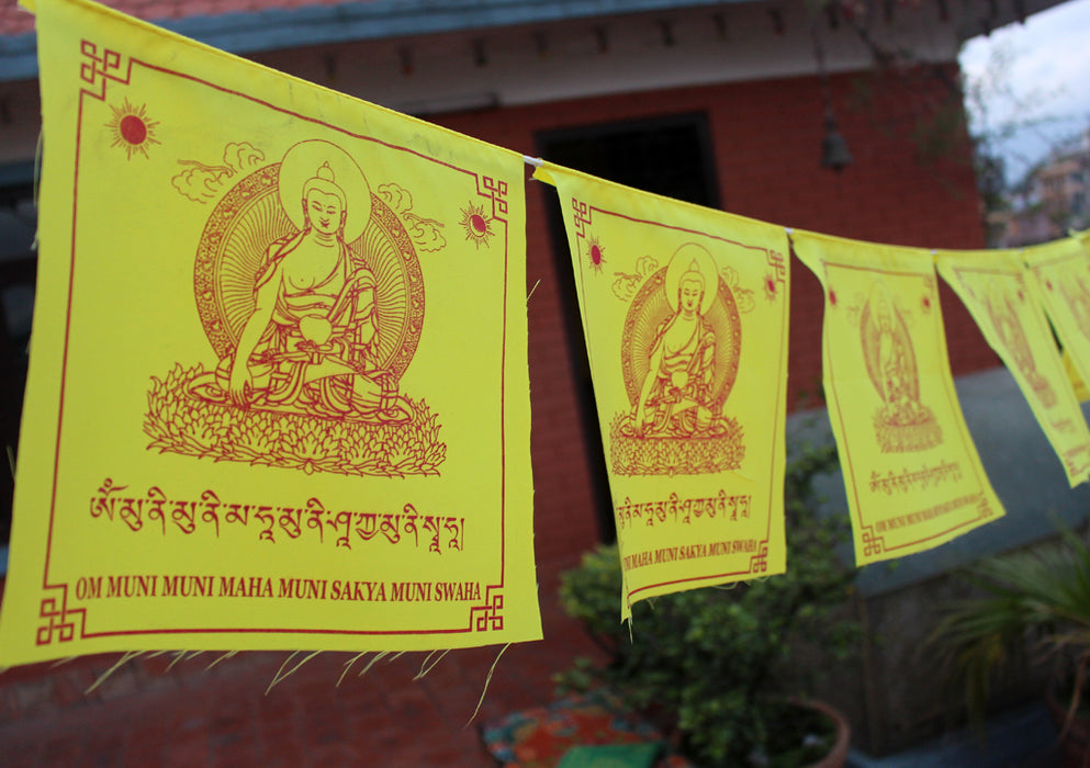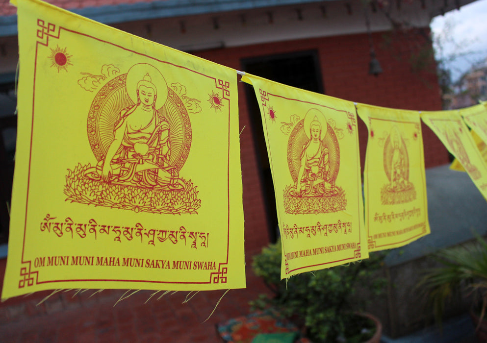 This is a cotton prayer flag handmade in Nepal. The color flag is printed in a yellow color that looks calming. An image of Shakyamuni Buddha is printed at the center along with associate mantras.