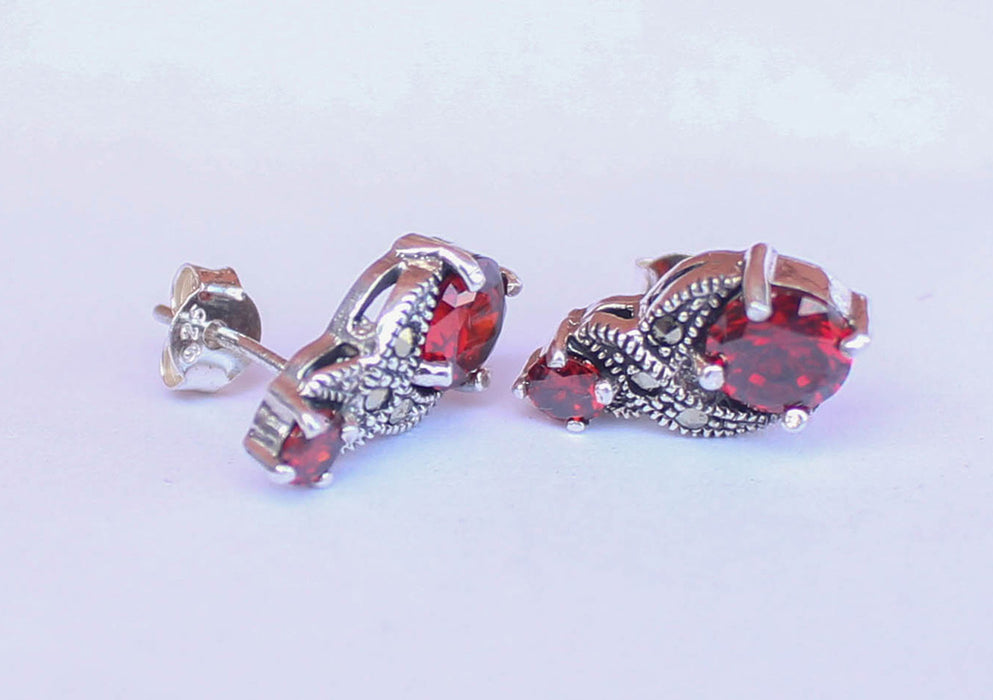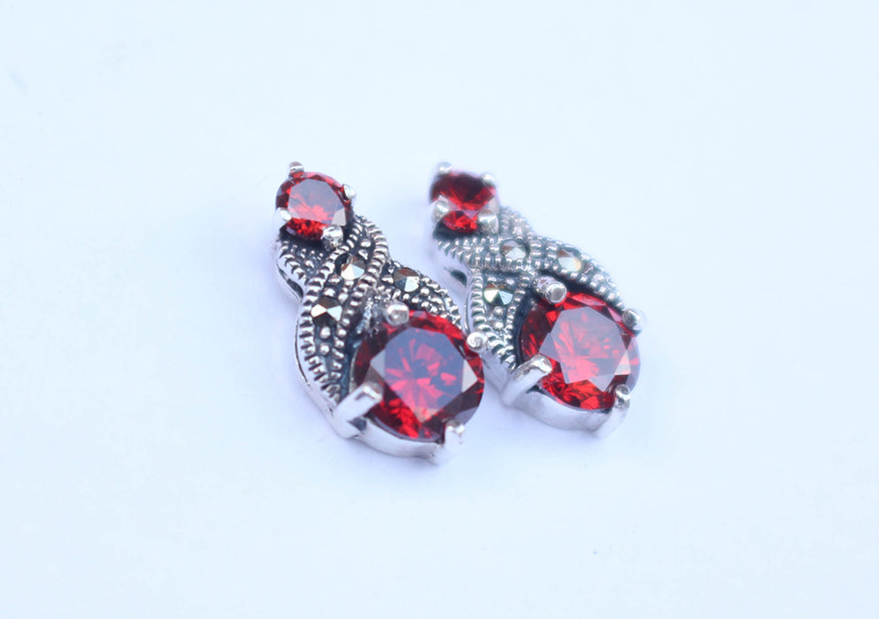 This finely carved shiny Garnet inlaid earrings is made in Thailand. The red Garnet is the attraction of this earrings. This earrings is made of 925 silver sterling.