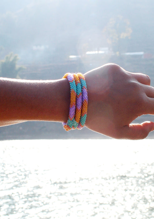 This is a very beautiful and stylish roll on glass beads bracelet handmade in Nepal. Made with the finest quality Czech and Japanese beads, the bracelet stretches as you roll it over your wrist. It fits most wrists as it is adjustable and will roll over around your wrist.