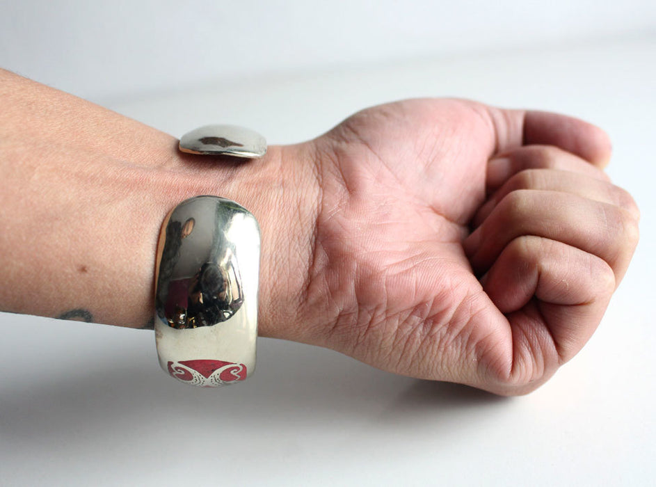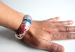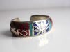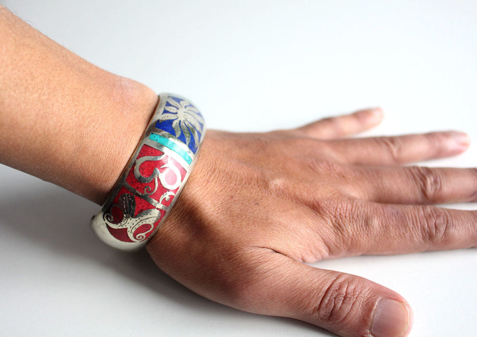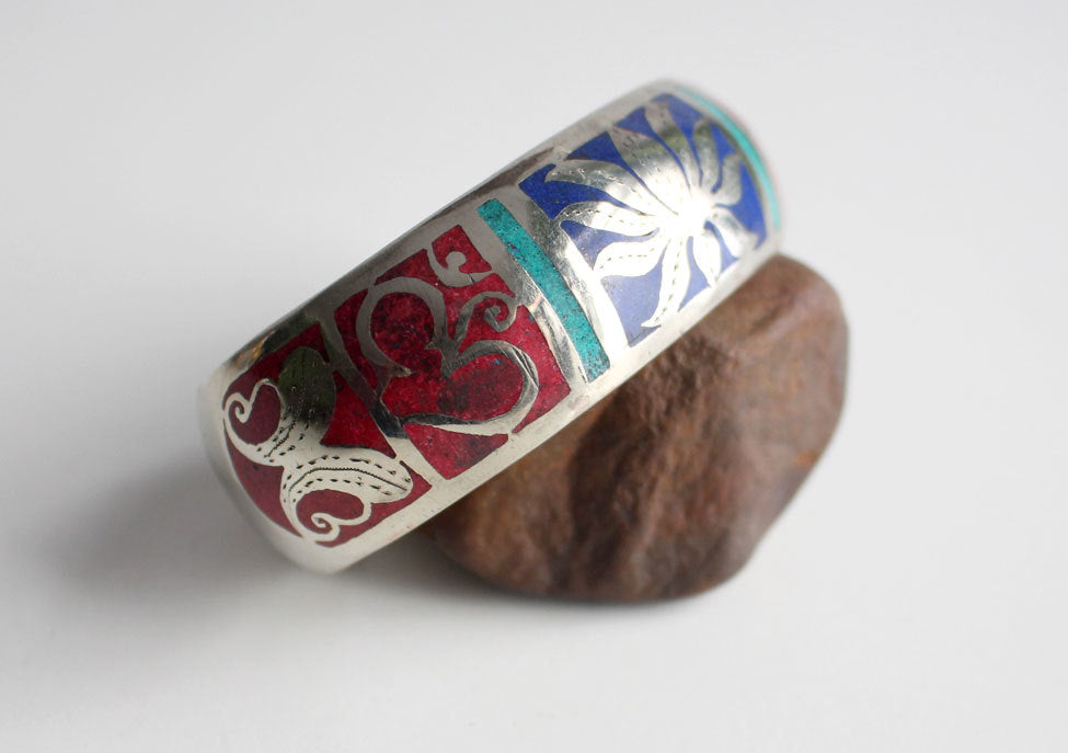 A very beautiful Turquoise, coral and Lapis Inlaid mosaic Silverplated Om Lotus Bangle. It is 8 inches in circumference and 0.8 inches wide. There are etchings of Hindu Om, Lotus and Double Fish on this bangle.