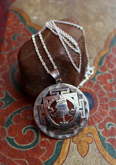 The pendant is in round shape where mandala carving is done. The mail beauty of this pendant is that is has one of the eight auspicious symbol Victory in the middle of the pendant.