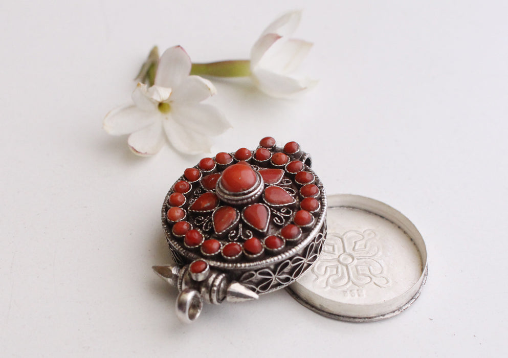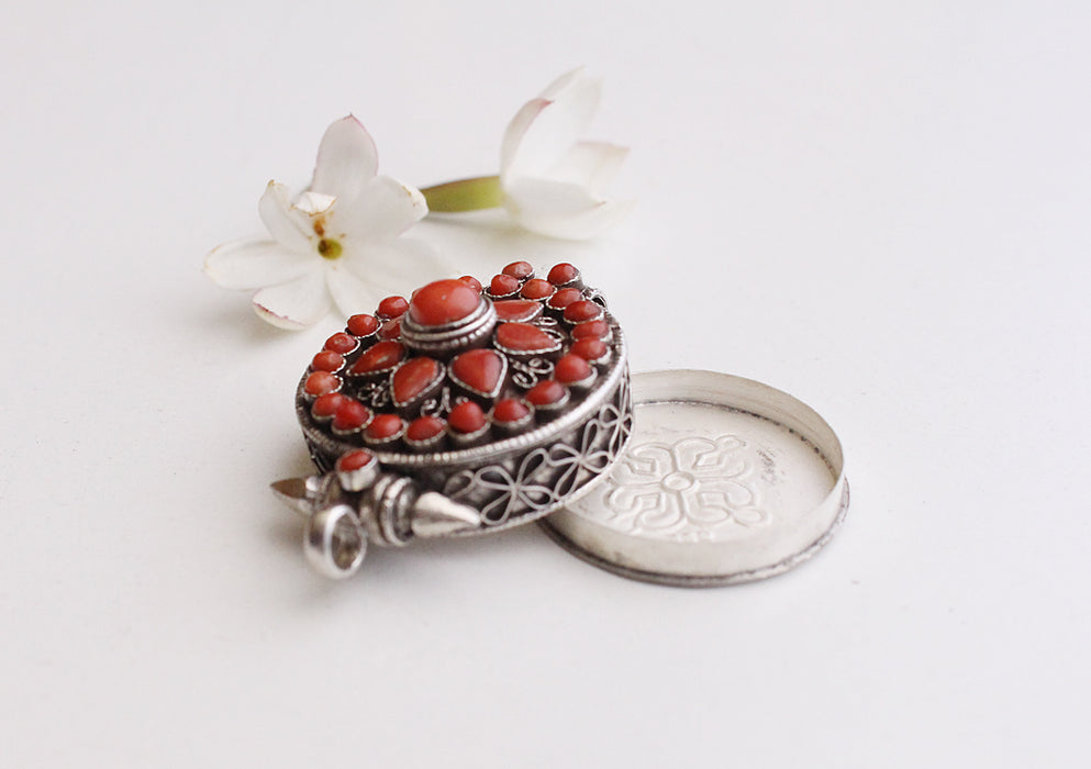 This Tibetan Ghau Pendant is beautifully made with Resin Coral Stone decorating outer surface with Plumeria flower that looks attractive and beautiful.
