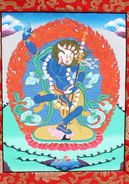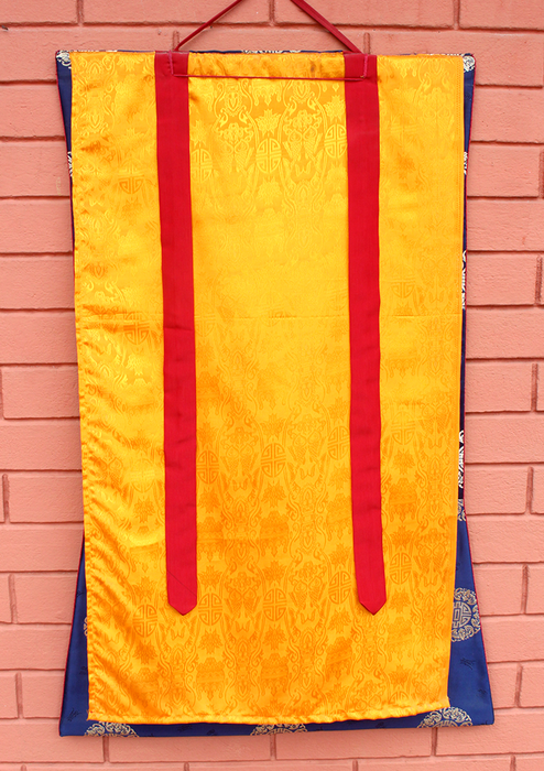 This is a beautiful Simha Mukha Embroidered Wall Hanging Banner with Brocade. This stunning piece showcases the elegant form of Simha Mukha, invoked to protect practitioners from obstacles, negative forces, and external threats to the practice of Buddhism. Crafted with meticulous attention to detail, the intricate design is complemented by a lavish brocade border, adding an opulent touch to any space. Whether gracing your meditation corner or adorning a prominent wall, this wall-hanging emanates a sense of tranquility and grace. Elevate your surroundings with the presence of Simha Mukha and the timeless elegance of this finely-crafted wall-hanging with brocade.