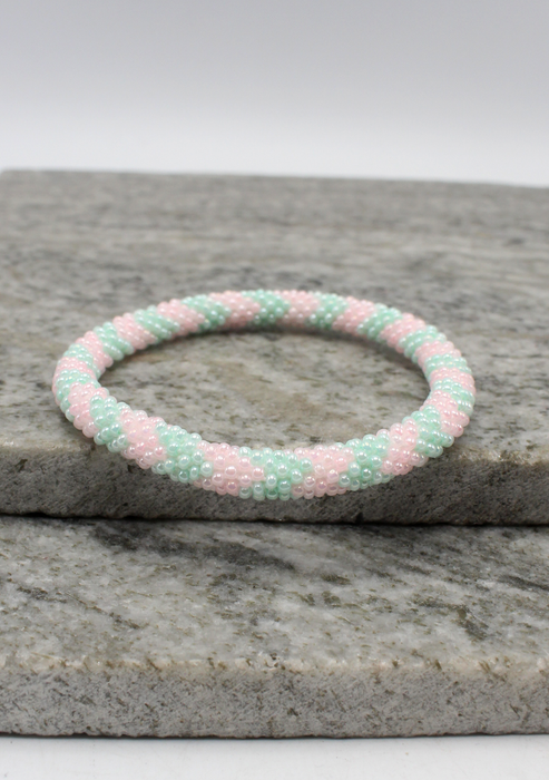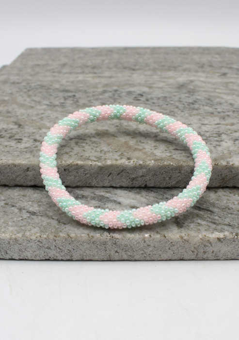 Sliver Green Nepalese Roll On Bracelet has been meticulously crocheted by our women artists. Our women artists have carefully hand-strung this fairly traded Roll On bracelet.