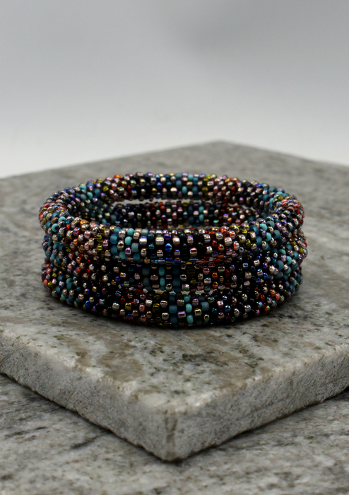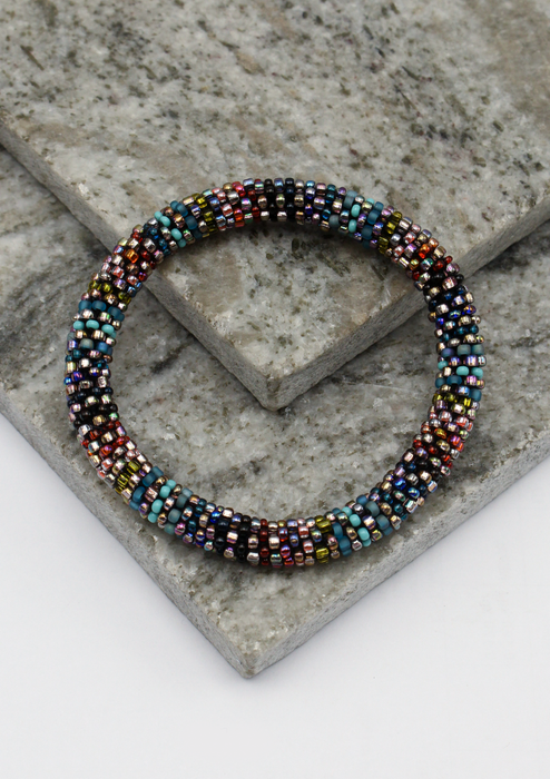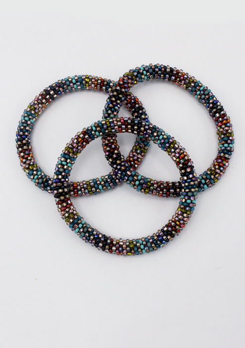 These fairly traded glass beads bracelet are meticulously crocheted by our women artists. Our woman artist carefully hand-strung these Roll On bracelet to give them the best shape and design.