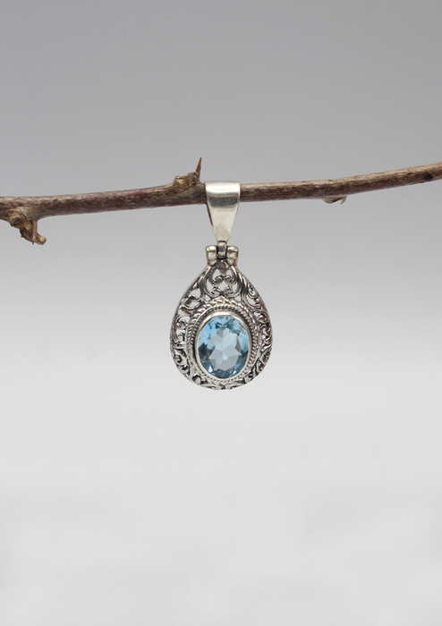 This is a beautifully Silver Sterling Pendant feature blue topaz paired with an 925 sterling silver filigree design.
